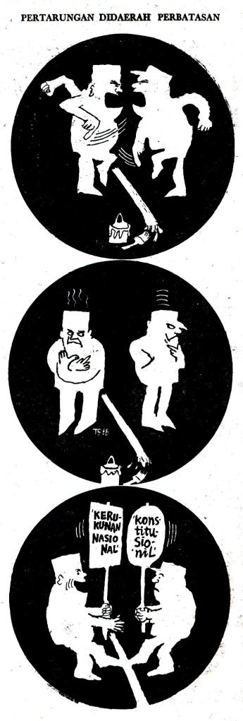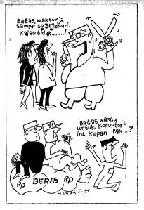 TAPI, REAKSINYA BEDA. Tergantung kadar idealisme masing-masing. Lain Bandung, lain Jakarta.SOAL BATAS WAKTU. Setelah tentara berkuasa bersama Soeharto, terjadi sejumlah perubahan sikap kalangan penguasa yang kadang-kadang samasekali tak masuk akal. Rambut gondrong dimusuhi. Penguasa misalnya pernah memberi batas waktu sampai 31 Januari 1968 untuk mode rambut gondrong. Muncul karikatur Harjadi Suadi dengan pertanyaan kapan batas waktu para koruptor untuk mengakhiri korupsinya.