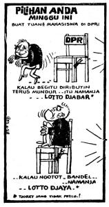 ‘MAHASISWA JUGA MANUSIA’. Apakah mahasiswa pergerakan tahun 1966 sepenuhnya adalah pejuang moral yang serba idealistis? Tiga karikatur, coretan T. Sutanto di tahun 1966 dan dua lainnya yang dibuat Ganjar Sakri tahun 1968, menunjukkan bahwa “mahasiswa juga manusia, punya rasa punya hati” dan punya hasrat-hasrat pribadi. Ada yang tetap idealis, ada pula yang tak luput dari kekhilafan-kekhilafan sehingga sempat juga jadi sasaran sindiran dan kritikan. Ada yang sensitif terhadap kritik dan ada juga yang ‘bandel’.DITUNTUT TURUN. Beberapa tokoh mahasiswa Jakarta dan Bandung, dengan alasan yang berbeda, menerima tawaran Soeharto untuk masuk DPR-GR. Sedang asyik di DPR, adik-adiknya dari KAPI/KAPPI menuntut turun.