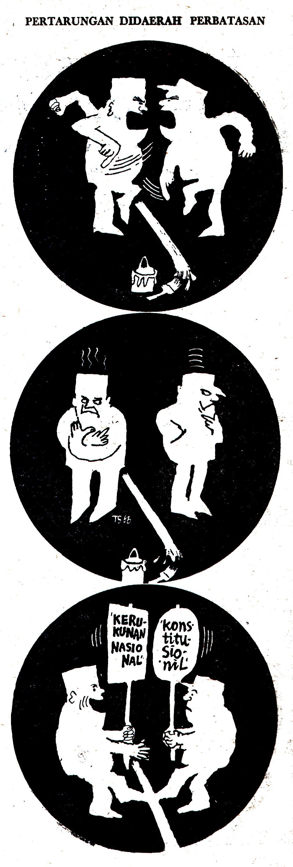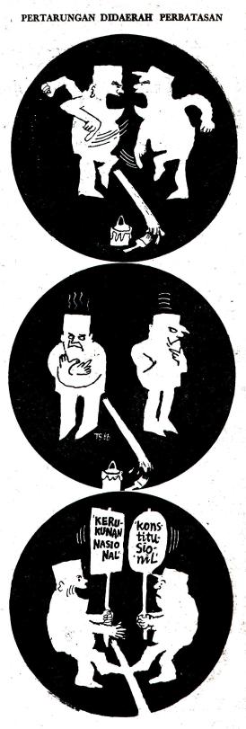 AKHIR SUATU TAWAR MENAWAR KEKUASAAN. Dengan usainya Sidang Istimewa MPRS tahun 1967, berakhirlah suatu tawar menawar politik dan kekuasaan antara Soekarno dan Soeharto. Dalam tawar menawar itu, setiap kali tersudut Soekarno menawarkan pola kompromi kerukunan nasional. Setiap kali pula Soeharto mengajukan senjata penyelesaian konstitusional yang zakelijk, seperti tergambar melalui karikatur yang diterbitkan November tahun 1966. Bagi Soekarno, penyelesaian konstitusional bisa satu paket dengan pengajuan ke Mahmillub. Soekarno akhirnya mengeluarkan Pengumuman Presiden 20 Februari 1967 tentang penyerahan kekuasaan kepada Soeharto. Suatu penyelesaian ‘bawah tangan’, duapuluh gari sebelum SI MPRS, yang menuai banyak kecaman.