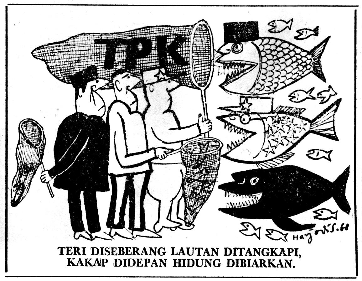 PEMBERANTASAN KORUPSI YANG SELALU GAGAL. “Maka jangan terlalu berharap pemberantasan korupsi atau penegakan hukum di strata atas (penyelundupan, kecurangan bisnis, praktek monopoli, dan mungkin perdagangan narkoba) akan berhasil dengan cepat seperti yang diharapkan”. (Karikatur 1968, Harjadi S)