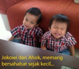 JOKOWI-AHOK MASA KECIL. Foto plesetan di BBM. “Salah satu ‘azimat’ keberhasilan pasangan Jokowi-Ahok adalah penggunaan baju kotak-kotak dengan warna yang kontras, sedikit jreng dan oleh banyak orang pada mulanya dianggap sedikit norak”.