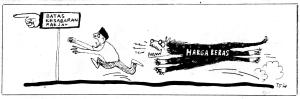 DIKEJAR PENDERITAAN EKONOMI. “Tak ada pemerintahan sepanjang sejarah Indonesia merdeka yang terbukti telah bersungguh-sungguh memenuhi amanat UUD untuk mencerdaskan bangsa, seiring sejalan dengan kegagalan menegakkan keadilan sosial dan ekonomi”. (Karikatur 1968, T. Sutanto)