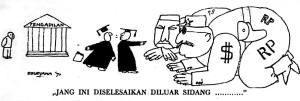 DARI DULU MENIKMATI PENYELESAIAN LUAR SIDANG. “Pada dasarnya, memang telah tercipta semacam tradisi bahwa bilamana seorang anggota militer, khususnya para perwira tinggi, terlibat dalam korupsi di luar institusi-institusi militer, kemungkinan besar akan diselamatkan”. Karikatur D. Sudiana, 1970.