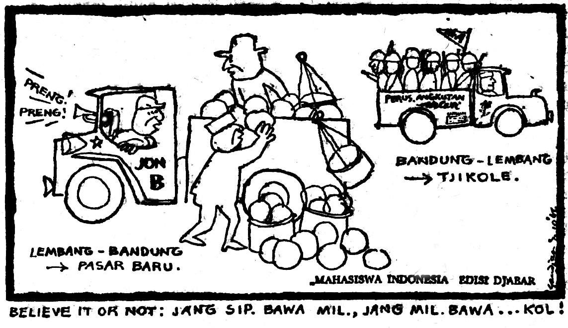 ‘HUBUNGAN SIPIL-MILITER’. Yang ini, intermezzo ringan tentang hubungan sipil-militer sehari-hari. Kendaraan milik sipil ‘dipinjam’ tentara untuk keperluan ‘dinas’, mengangkut personil dari Bandung ke Lembang-Tjikole (tempat latihan militer). Sementara itu, truk milik militer sendiri dipakai ‘ngobyek’ untuk ‘membantu’ mengangkut sayuran pedagang dari Lembang ke Pasar Baru, Bandung.